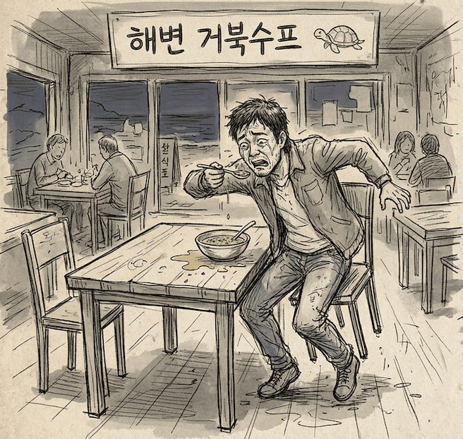 한 남자가 바닷가 식당에서 거북수프를 한 입 먹고는 밖으로 뛰쳐나가 울었다. 그리고 집에 돌아가 자살했다. 왜 그랬을까?